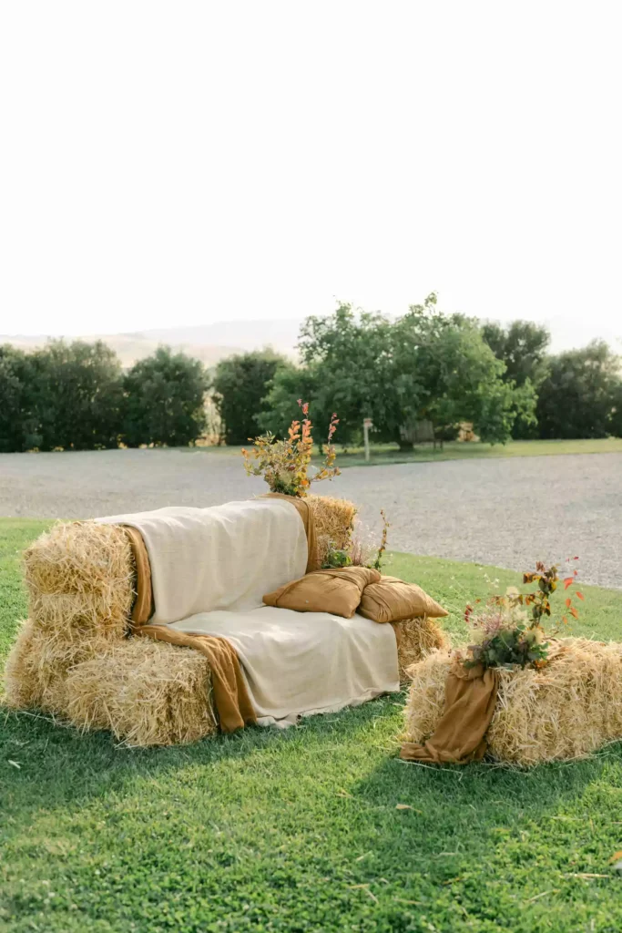 Use hay bales to create seating areas and decorate them with whimsical flowers, colorful pillows, and soft sheets. This rustic touch will give your venue an inviting atmosphere while keeping things stylish.