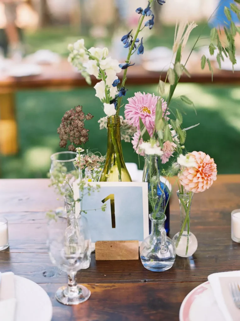 Create a full centerpiece on a budget by clustering various vases or glass bottles. Deconstruct budget-friendly mixed bouquets into single stems for a layered, chic effect that doesn’t stretch your budget.
