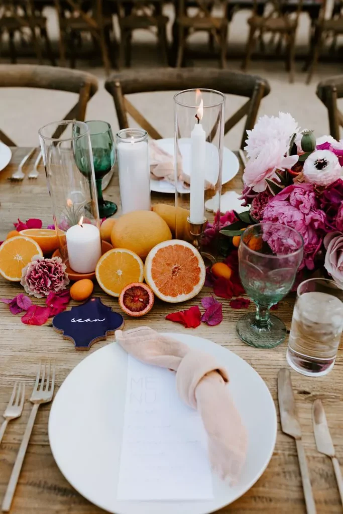 Grocery store finds, like fresh fruit, can elevate your centerpiece. Seasonal fruits such as citrus in the summer or pears and pomegranates in the fall add rich, vibrant pops of color. Even vegetables like artichokes can bring a unique touch.