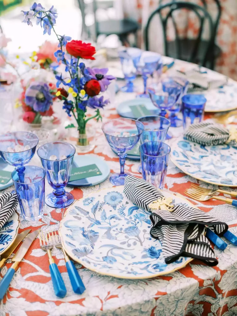 Tinted glassware is an easy way to add vibrant color to your table setting. Stick to one shade for a cohesive look or mix different hues for an eclectic feel. Amber and blue are personal favorites for their warm and cool contrasts.