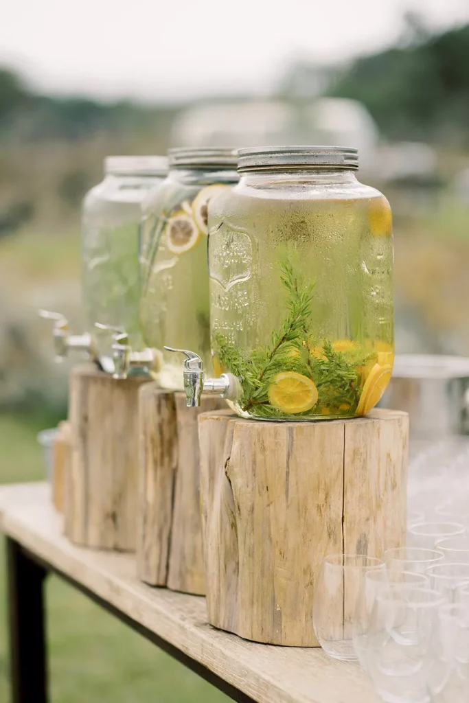 Add a personal touch with a DIY beverage station. Pre-mix drinks like lemonade or iced tea in large glass dispensers for a refreshing twist, or serve something more spirited like Palomas or cocktails.