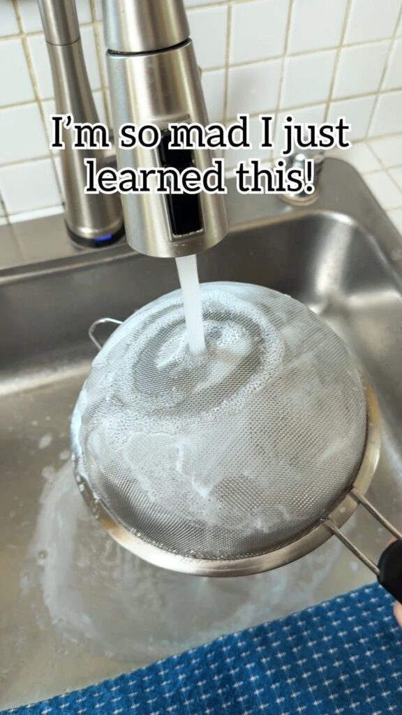 Tired of struggling with cleaning your fine mesh strainer? Here’s a simple hack that will save you time! Instead of trying to scrub it manually, just place it under running water while holding it at an angle, allowing the water to wash away any trapped food particles. The water will flow through the mesh effortlessly, cleaning it without the need for excessive scrubbing. It’s an easy, no-fuss way to clean your strainer and keep it looking brand new!