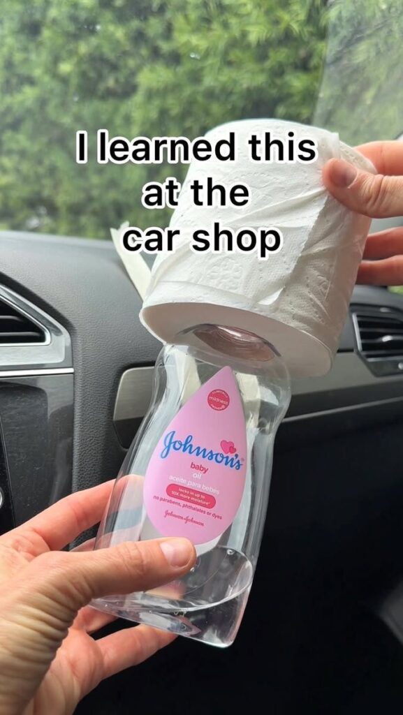 Did you know that you can repurpose an empty baby oil bottle to create a handy tissue dispenser? Simply place a roll of toilet paper inside the bottle, and pull the tissues through the spout! This simple hack is perfect for your car or any small space where a traditional tissue box may not fit. It’s a space-saving solution that’s both practical and budget-friendly!