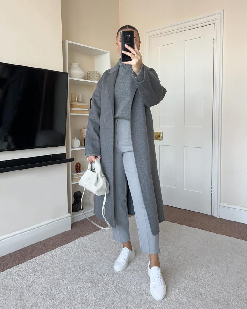 This all-grey outfit is a total winter win! The long tailored coat layered over a cozy knit and fitted trousers keeps things clean, classy, and warm—all at once.