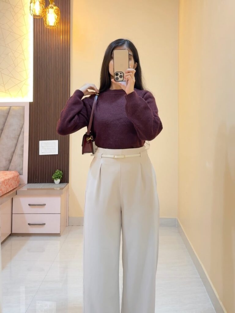 This outfit is proof that rich jewel tones and creamy neutrals are a match made in winter heaven. The fitted wine sweater adds warmth and depth, while the high-waisted cream trousers keep things sleek and structured.