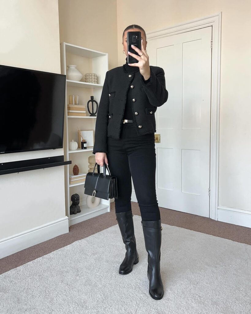 There’s just something about an all-black outfit that always looks polished. This structured black jacket with metallic buttons gives major luxe vibes, especially paired with fitted pants and classic knee-high boots.