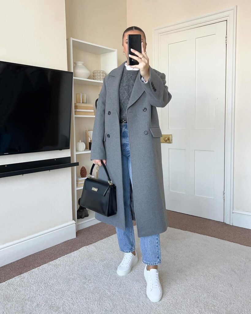 When comfort meets style—this is what it looks like! The oversized grey coat instantly sharpens up the laid-back combo of a dark sweater and light-wash jeans.