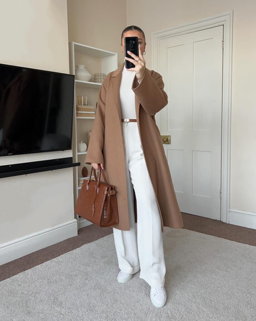 This outfit is the definition of quiet luxury. The rich camel coat paired with all-white pieces creates a clean, elevated winter look that feels both cozy and expensive (without trying too hard).