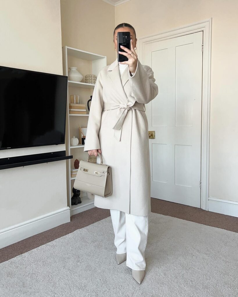Soft, structured, and so serene—this all-white look is a breath of fresh air for gloomy winter days. The belted wrap coat flatters the waist while keeping things minimal and elegant.