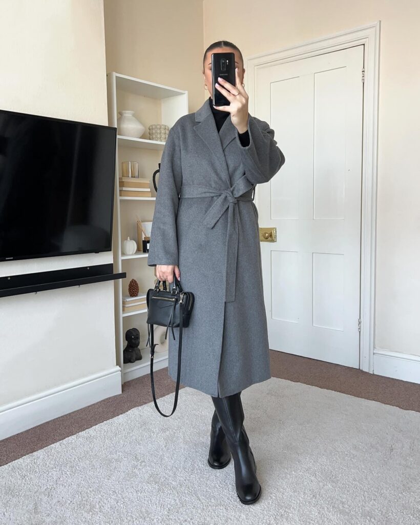 Sometimes, less really is more—and this outfit proves it. The belted grey coat cinches the waist just right, while the sleek black boots and matching mini bag create a clean, balanced look. Underneath? A simple black base layer keeps things warm and cohesive.