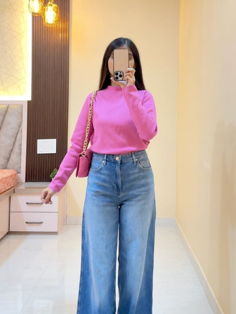 Why blend in when you can stand out? This hot pink sweater paired with wide-leg jeans brings a fresh, playful twist to winter fashion. The matching pink shoulder bag adds that coordinated vibe without trying too hard.