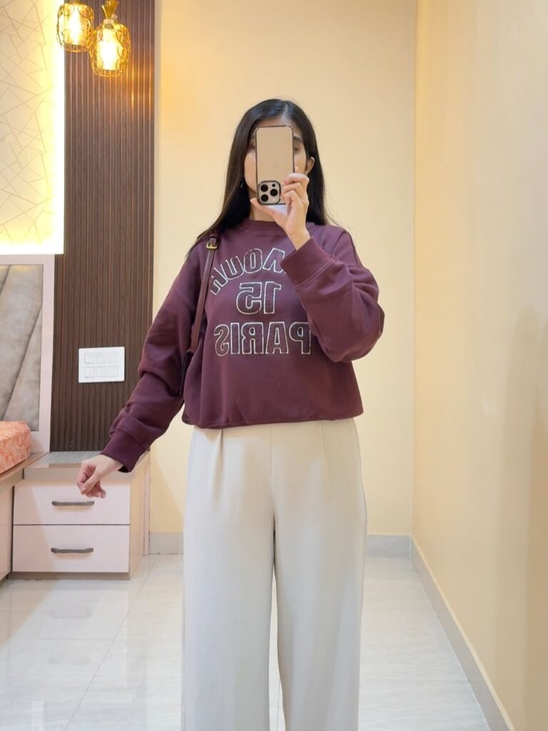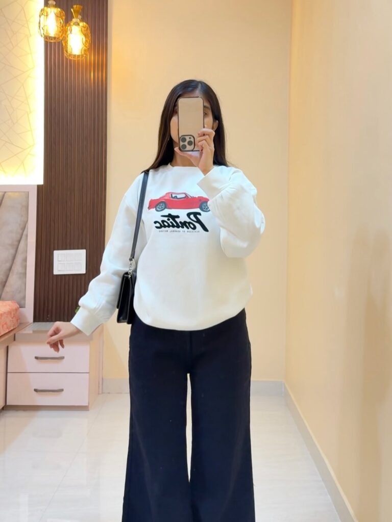 Because sometimes, all you need is a cute graphic sweatshirt and wide-leg pants to slay the day. This comfy look blends effortless cool with a playful twist—ideal for cozy weekends, casual meetups, or a chill travel day.