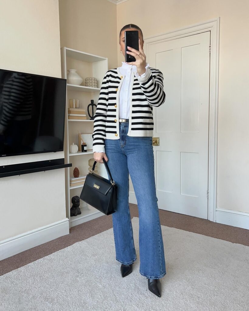 Classic, comfy, and full of personality—this striped cardigan over a crisp white blouse gives total French-girl winter vibes. Paired with flared jeans, pointed boots, and a structured black bag, it’s effortlessly stylish.